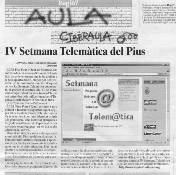 AnuncisNotícia a Regió 7 ( 20/03/2001) 20 març 20017 setembre 2023 Publicada en el Regió 7 la notícia sobre la celebració de la IV Setmana Telemàtica Notícia enviada per: