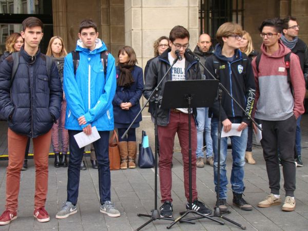 L’alumnat de Filosofia ha participat en els actes de ciutat del 25 de novembre, que han estat un clam contra la xacra de la violència de gènere. En la primera part del matí, hem interactuat en l’obra 100 leakes, de la companyia NusTeatre. A les 12h, l'acte central ha consistit en la lectura dels manifestos commemoratius, una actuació musical del Taller de cançons de tots els temps i una acció artística a càrrec d'alumnes de l'institut Lluis de Peguera. El manifest 2016 que ha elaborat l'alumnat de l'Institut Pius Font i Quer, guanyador del concurs adreçat als alumnes de secundaria de la ciutat; l'ha llegit l'alumne Eduard Pozuelo, autor del text conjuntament amb els alumnes Nil Boix, Marc Cuevas, Jordi Gort i Arnau Plaja.