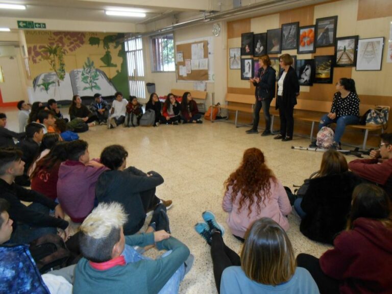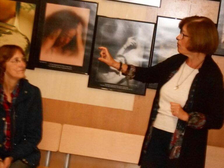 L’alumnat de Psicologia i Sociologia va gaudir de la presència de la Conxita, membre de Lilium, i de la Pura, fotògrafa de Foto Art; dues de les creadores de l’exposició Trencant el silenci. Van comentar cada un del textos de testimoniatge a partir del quals, per sorteig, creà cada fotògrafa la seva composició artística. Va donar–se un diàleg molt viu, on es desgranaren aspectes socials i psicològics que pateix la víctima de la violència masclista. Com ha passat altres vegades, una alumna se’ns obrí i ens explicà la seva mala experiència. El tems es congelà per uns instant. Ens frapà!