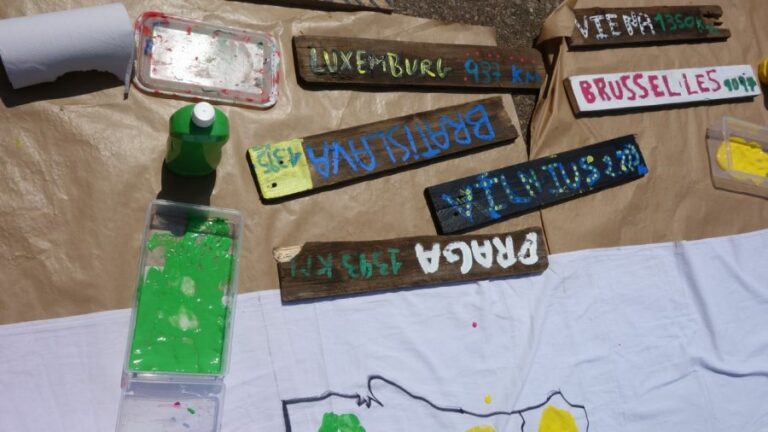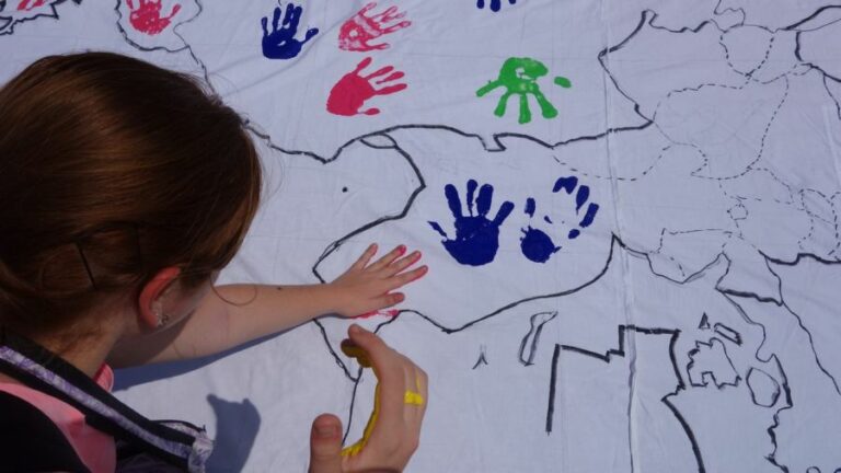 Els alumnes de 1r d’ESO van fer un mapa d’Europa i a l’acte cada un d’ells va deixar impremtades les seves mans dins de la silueta.