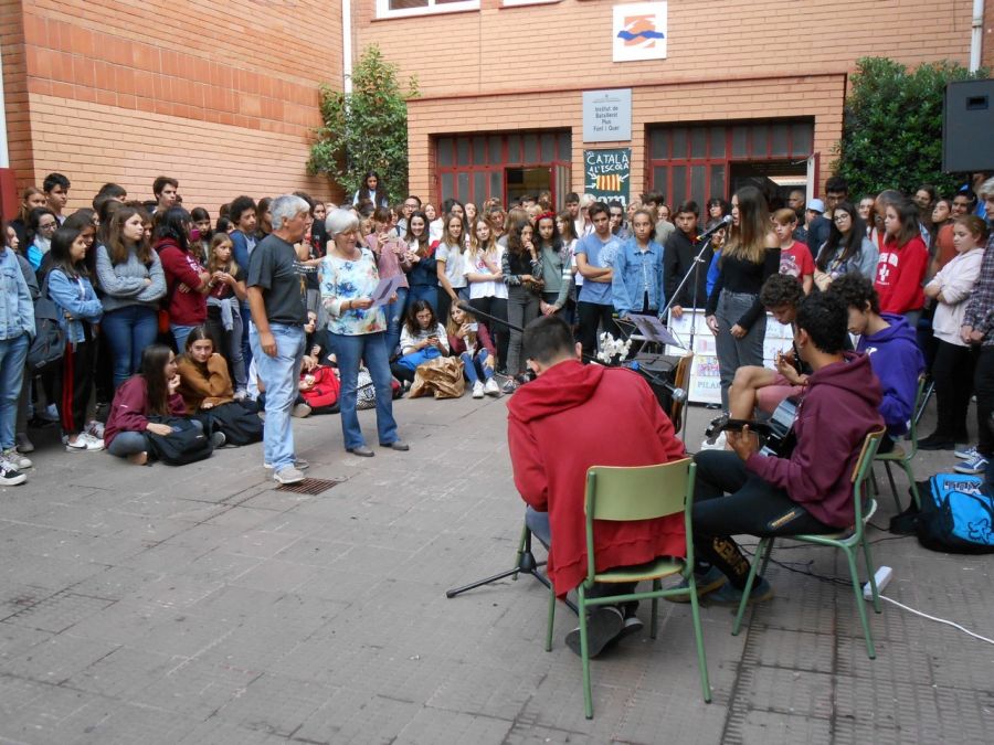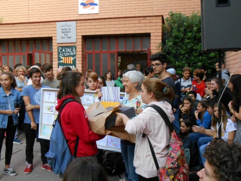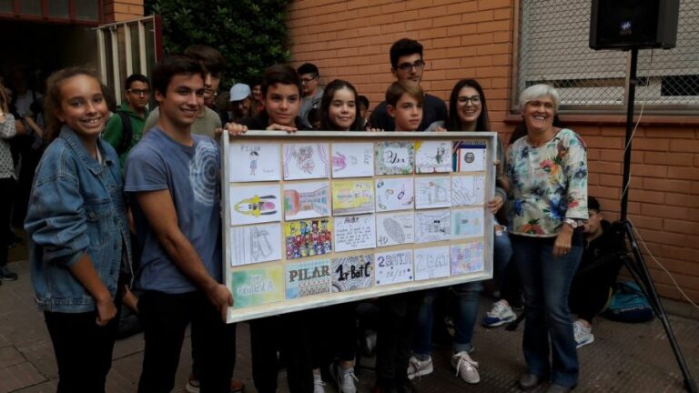 Tots els delegats i delegades de curs, han fet entrega d’un quadre conjunt, compost per una postal elaborada per cada grup. També se li ha fet entrega d’una capsa amb quatre llibres artesanals, compostos de postals escrites per l’alumnat i personal no docent, entregat pels benjamins de 2ESO.. Complint el desig de l’homenatjada, ha tingut la sorpresa de l’oferiment d’un gravat, portat pels ganàpies de batxillerat. La cirereta final, ha estat les notes i cant dels Goigs de la Mare de Déu del Claustre de Solsona. Solsonina com és, la Pilar, també les ha entonat. Un agraïment per l’alumnat de 2batx, que ha dedicat força hores de pati pels arranjaments i assajos: Pau Serra Asensio, Jan Badia Torras, Néstor Bravo Egea, Maria Campabadal Morales, Miquel Pérez Ribas i Roger Vila Perramon. Disfruta-ho Pilar, que ho tens ben merescut!