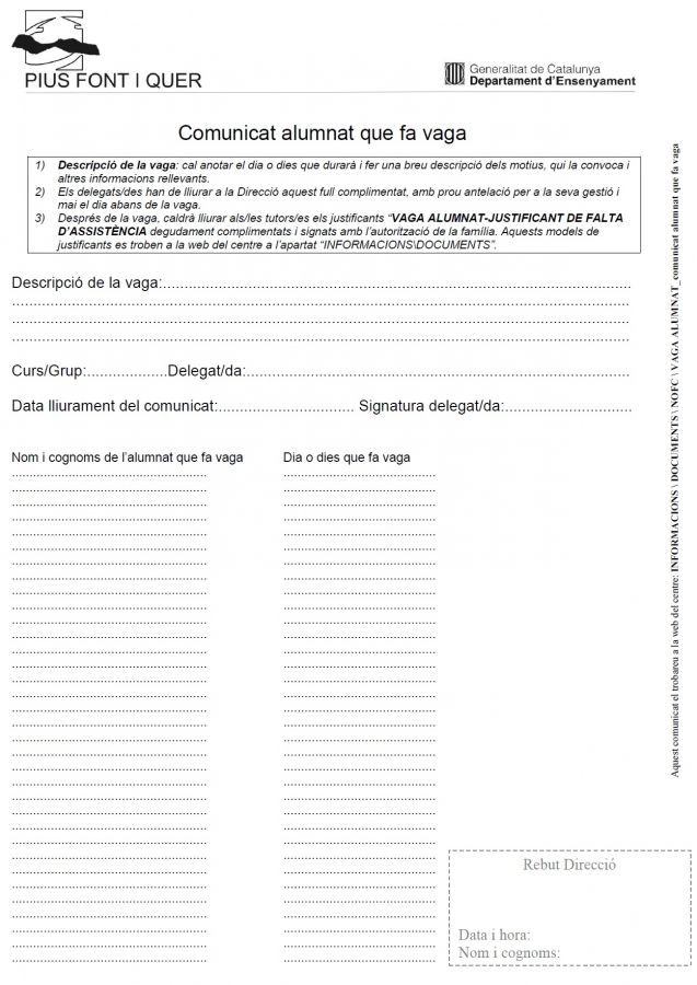 Per tal de regular el dret de vaga de l’alumnat que va de 3r d’ESO fins al 2n de Batxillerat, l’alumnat del centre disposa del model: “Comunicat alumnat que fa vaga”.