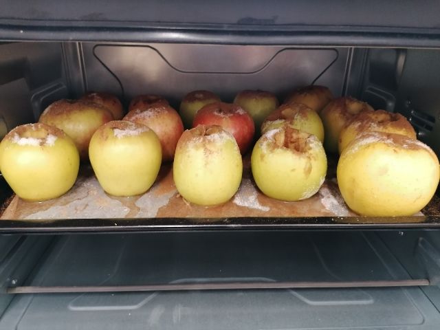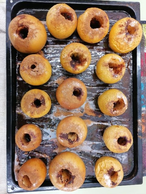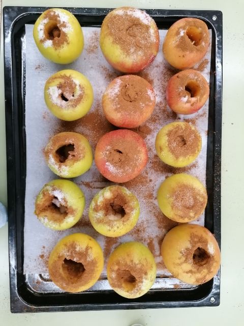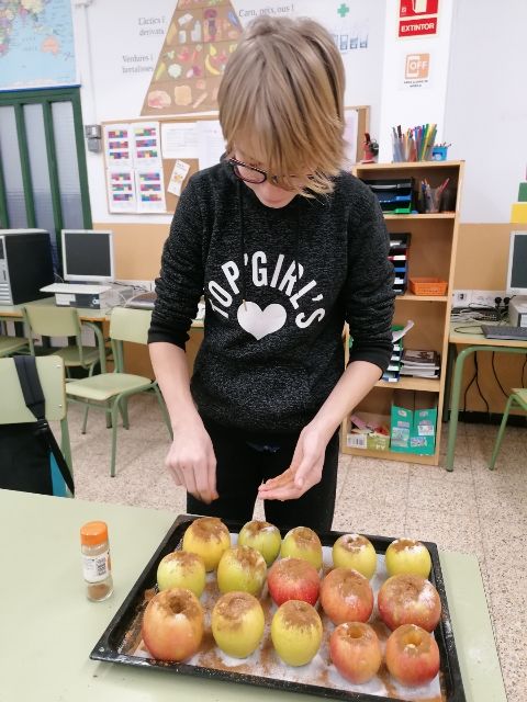 El passat dimarts vam cuinar pomes al forn. La recepta és senzilla però les pomes triguen una mica a coure’s. En primer lloc vam agafar les pomes i les vam netejar amb aigua. A continuació, amb un estri especial, vam treure el cor de les pomes, ja que no és gaire agradable menjar-se les llavors. Vam agafar una mica de mantega i la vam introduir al forat on hi havia el cor. Després, també hi vam posar, al mateix espai, sucre i canyella en pols. Un cop vam tenir tot això, vam posar les pomes a la safata del forn i vam posar una mica d’aigua a la base per a poder fer caramel. Vam ficar les pomes al forn a 200ºC durant 40 minuts. En acabar, les vam posar en carmanyoles amb una mica de caramel per sobre i ens les vam emportar a casa per compartir-les.