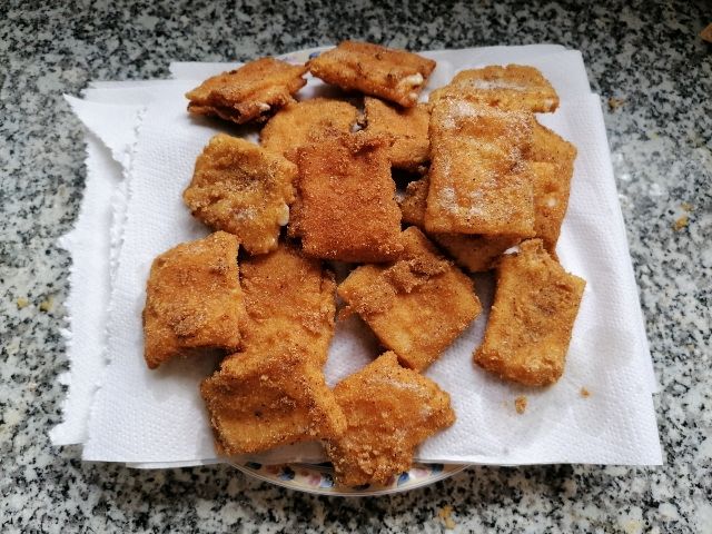 Agafem dos talls de pernil dolç i els posem l’un a sobre de l’altre. Posem a sobre un o dos talls de formatge (segons el nostre parer) i tornem a posar dos talls més de pernil. Quan ho tenim ben alineat, els tallem en quadradets petits i els passem per farina, ou i pa ratllat, seguint aquest ordre. Tot seguit, els fregim en una paella amb oli ben calent. Daurem cada cara un minut, els traiem de la paella i els posem a sobre de paper absorvent. Arribats a aquest punt, només restarà servir-los amb un acompanyament lleuger, com una amanida, i gaudir del seu sabor.