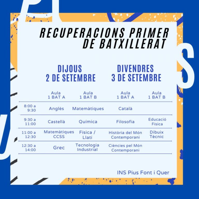 Ja teniu disponibles els horaris dels exàmens de l'avaluació extraordinària de 1r de Batxillerat, que començaran el proper dijous 2 de setembre.