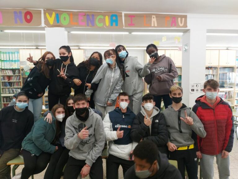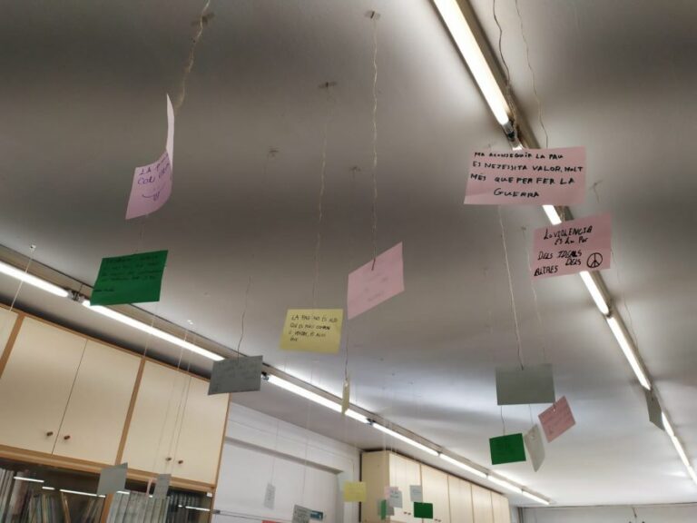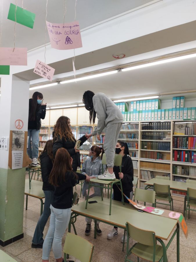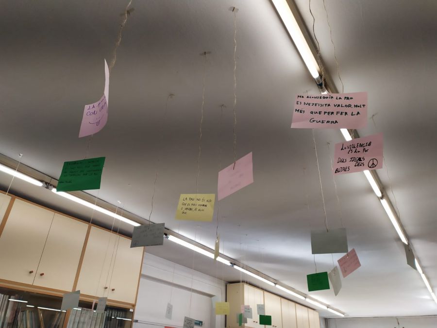 Amb els alumnes de Filosofia de 4t d’ESO hem volgut reflexionar sobre la violència i hem dut a terme una activitat que hem exposat a la Biblioteca del centre on trobareu penjats una multitud de missatges en defensa dels valors relacionats amb la pau i la tolerància.
