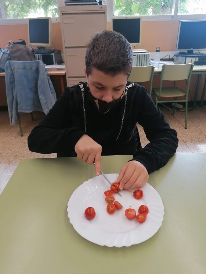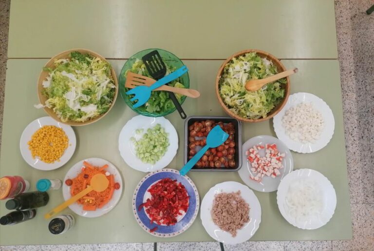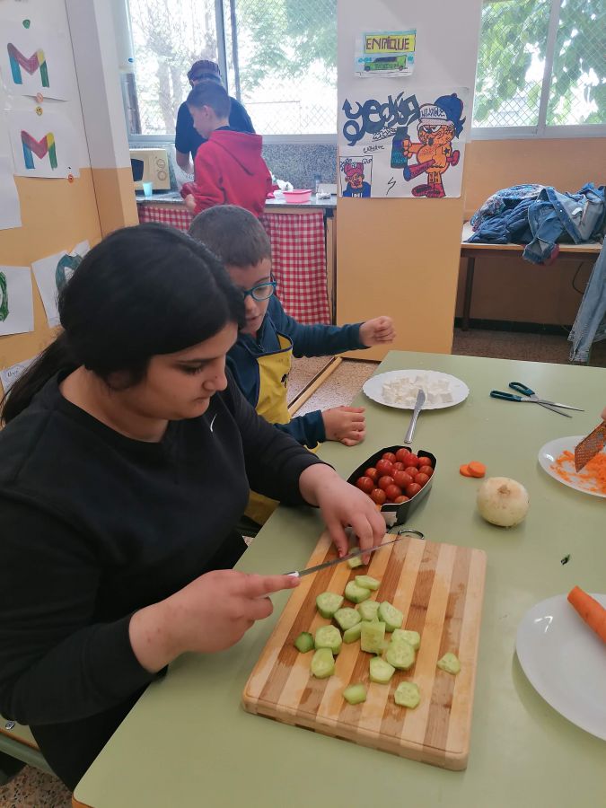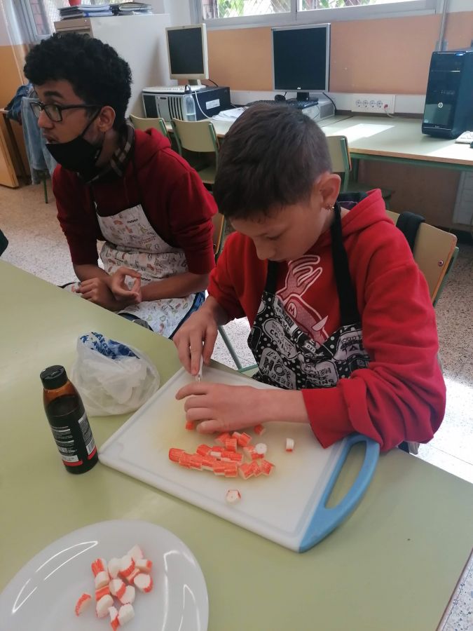 Vam començar netejant l’escarola i l’enciam. El vam tallar i el vam deixar en remull. Mentrestant, ens vam repartir la feina com a bons companys i mentre uns rentaven les hortalisses i les anaven tallant, els altres vam trinxar la tonyina i el blat de moro, i vam tallar el formatge feta en daus. Cada ingredient va ser treballat de forma individual i es va posar en un plat.