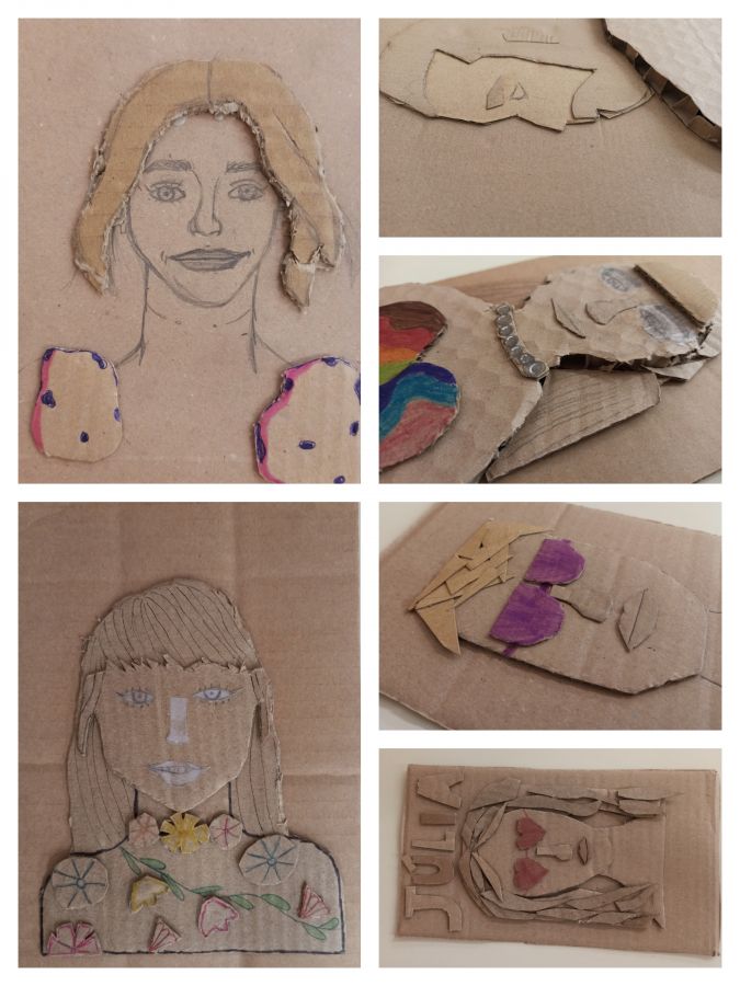 Els altres treballs que també podeu veure, van ser desenvolupats pels alumnes que van estar cursant l’optativa durant el segon quadrimestre. Són retrats en volum fets amb cartró sobre una persona que havia de ser un referent per l’alumne i, tant podia ser un amic/ga, com un familiar, com algú del món de l’esport, musical, artístic, etc. Els resultats també són molt variats pel que fa al plantejament i als acabats.