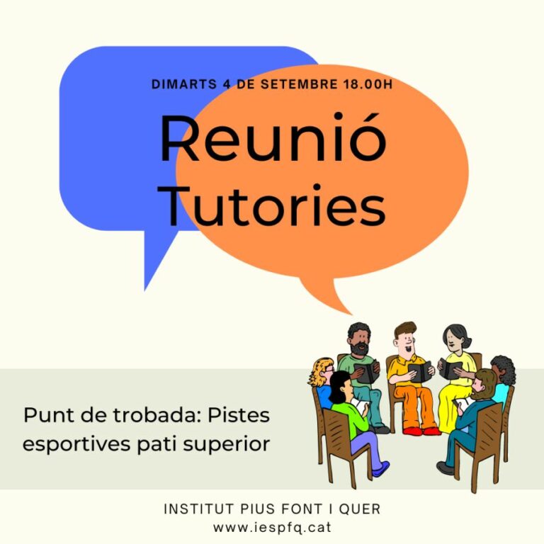 Us recordem que demà a les 18h hi ha la reunió de tutories de la classe dels vostres fills/es. El punt de trobada serà, per a tots els nivells i grups classe, les pistes esportives de la part de dalt del pati. Allà us rebrà l'Equip Directiu i, posteriorment, el tutor/a corresponent us acompanyarà a l'aula. És molt important que sapigueu a quin grup classe (lletra) assisteixen els vostres fills/es.