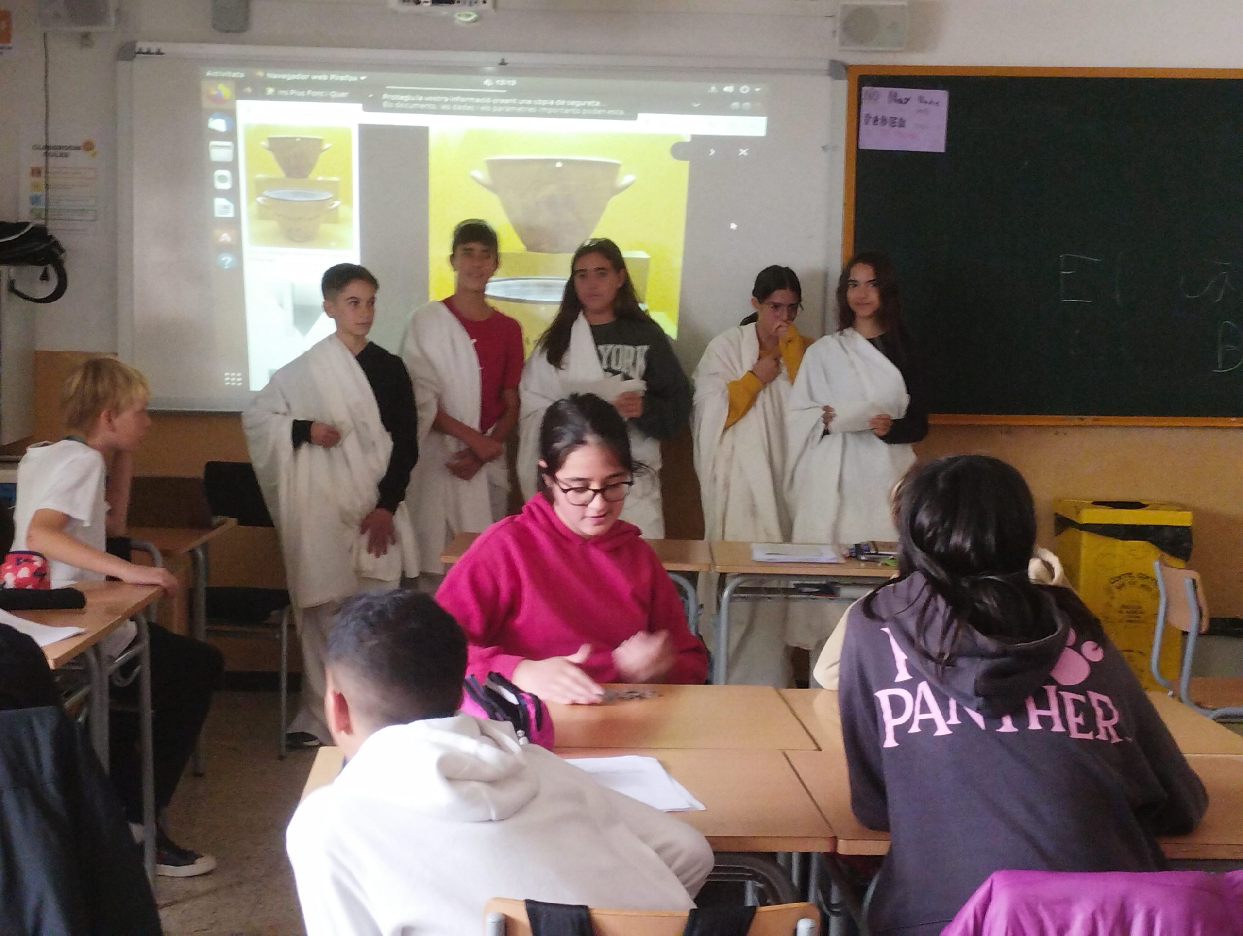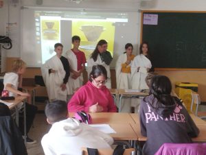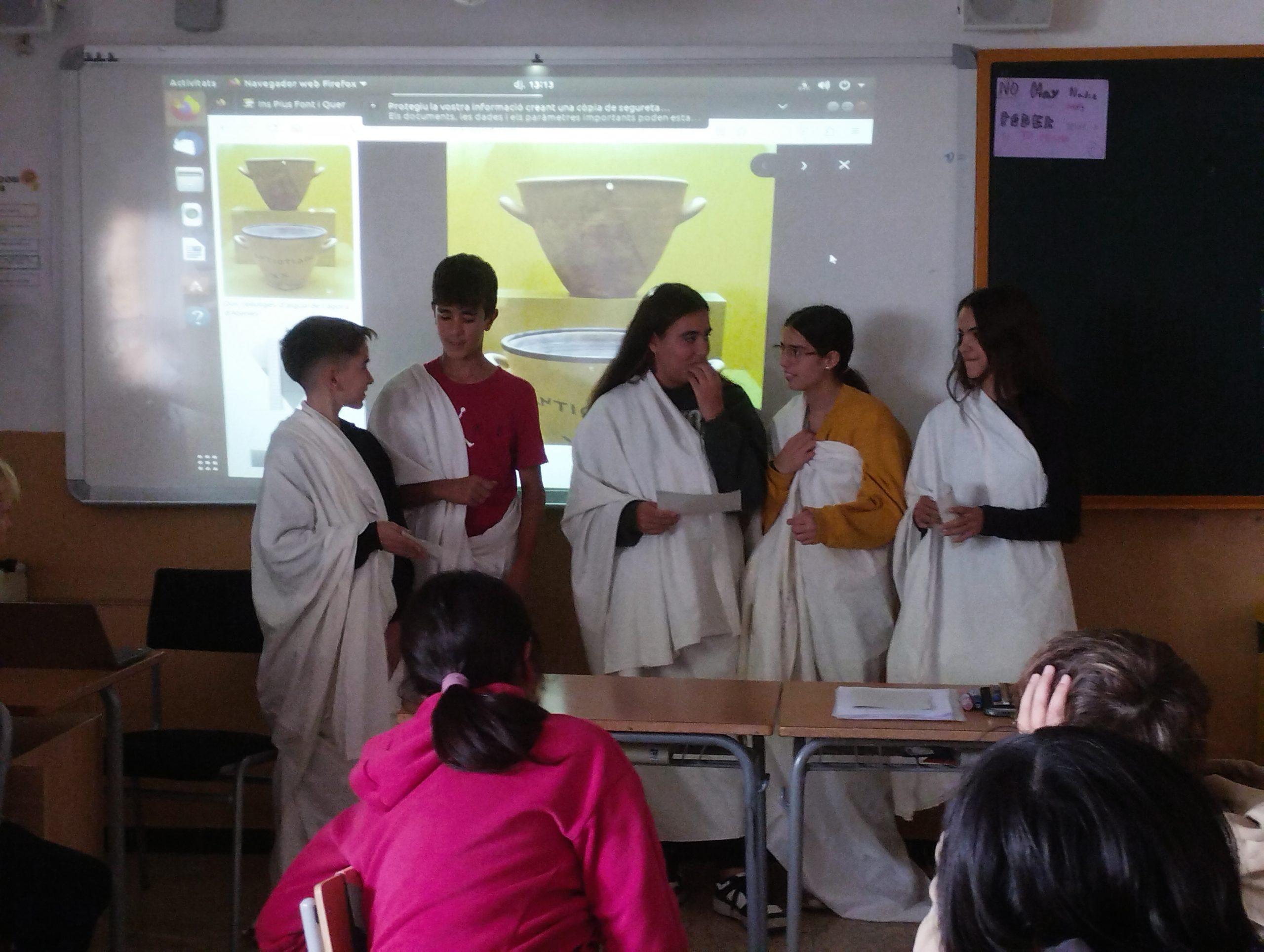 L’alumnat de 1r d’ESO A estem duent a terme un projecte sobre la democràcia. En el projecte treballem una part teòrica on aprenem, entre altres coses, els orígens, els tipus i les característiques d’aquesta forma de govern i, per altra banda, practiquem les habilitats que es precisen per poder conviure en pau en un règim democràtic (escoltar a l’altre, saber debatre, fer ús de la participació ciutadana, etc.). La setmana passada vam representar teatralment a l’aula l’assemblea atenenca. Primerament, els ciutadans del Consell dels Cinc-cents van proposar els temes a tractar a l’assemblea i, posteriorment ,els ciutadans de 1r d’ESO A van debatre i arribar a acords per resoldre els temes suggerits. Per fer-ho, vam tenir en compte el temps que ens marcava una clepsidra (rellotge d’aigua). Us deixem amb algunes fotografies del moment!