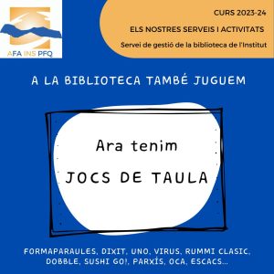 Des de l’AFA també volem contribuir- hi i fer créixer aquest fons, a partir de jocs de taula que les famílies tingueu a casa en BON ESTAT i que ja no utilitzeu. Si en teniu algun i ens el voleu cedir podeu portar-lo a la biblioteca, o bé, al despatx de l’AFA, de dilluns a divendres de 8 h a 14.30 h, els dimarts a la tarda també de 16 h a 18 h.