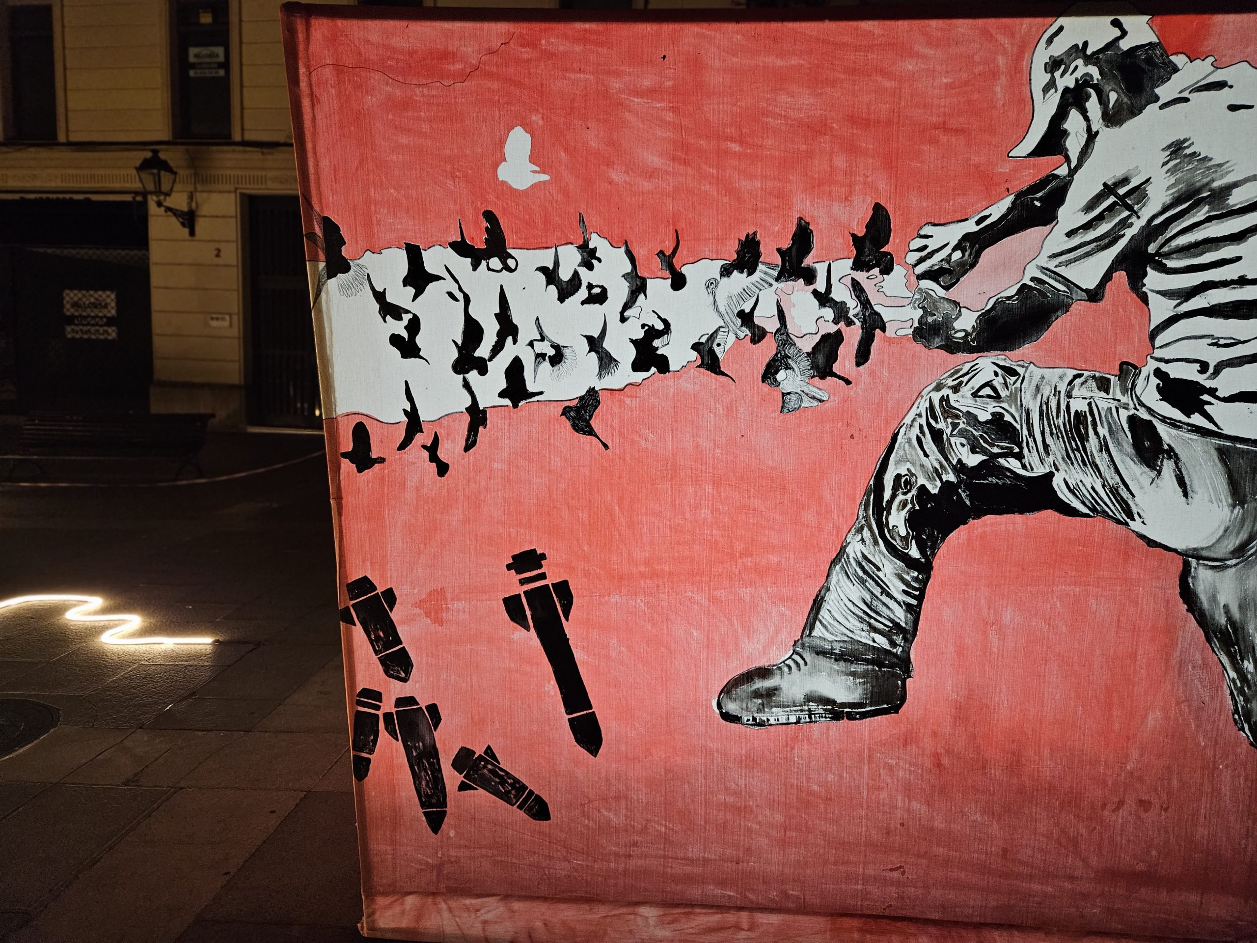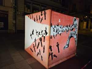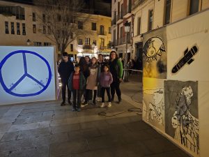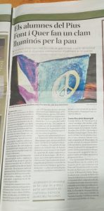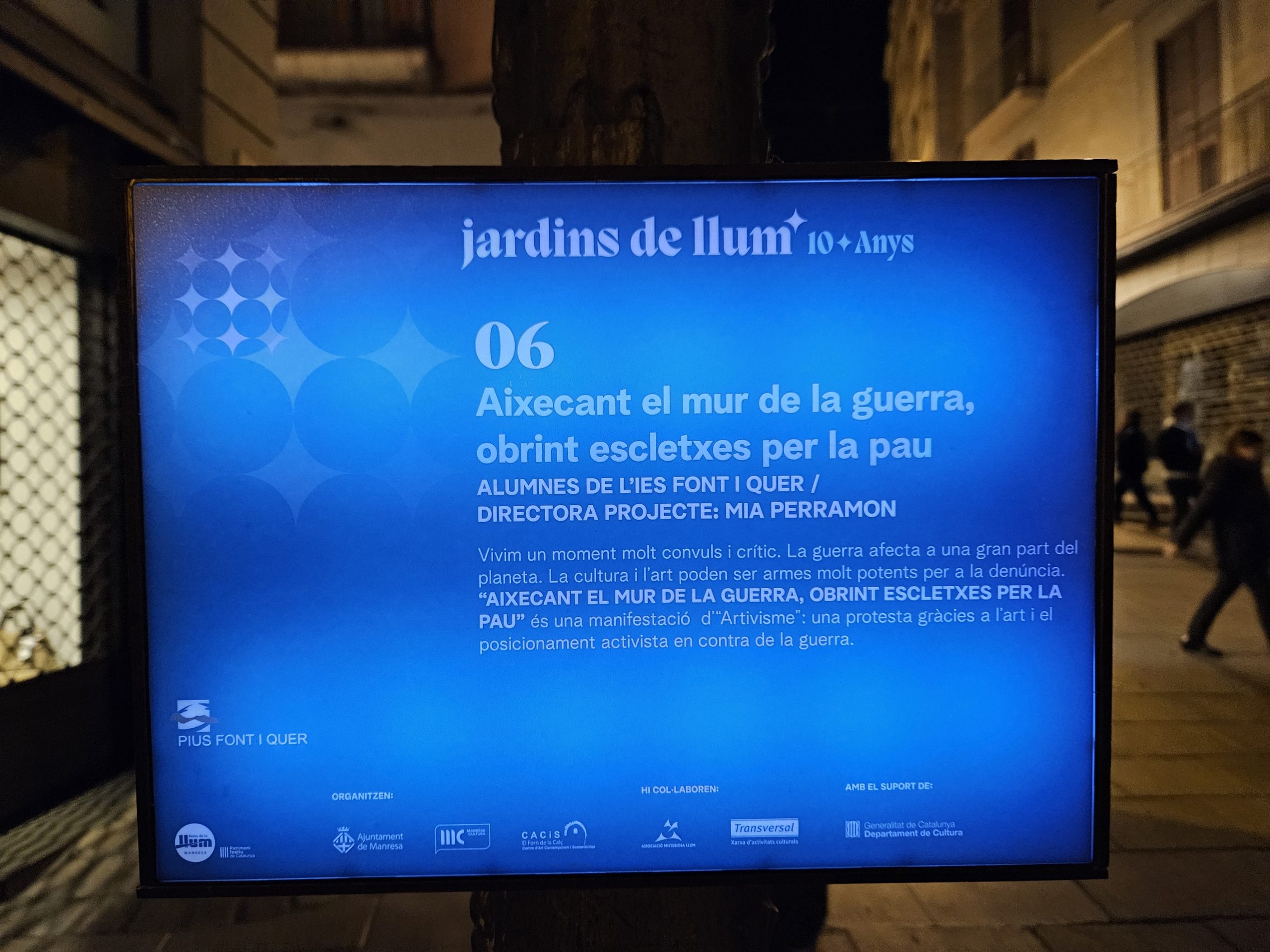 El cap de setmana passat amb motiu de la celebració de la festa major d’hivern de Manresa, va tenir lloc la 10a edició del Festival d’art Efímer “Jardins de Llum” que es fa per aquestes dades a Manresa.El Festival va tenir lloc els dies 17 i 18 de febrer i recorria els carrers del barri vell de Manresa.Des de l’Institut hi vam participar en les assignatures de Visual i Plàstica. Concretament els cursos de 1r de l’ESO, optativa de 3er de l’ESO de Projectes artístics de 4rt de l’ESO.El títol portava per nom “Aixecant murs contra la guerra, obrint escletxes per la Pau” La instal·lació volia fer un toc d’atenció a “la guerra”, com a sistema bèl·lic, per eliminar els conflictes que hi ha arreu del món.