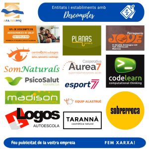 Incorporem a LOGOS AUTOESCOLA I SOBRERROCA al llistat d’establiments amb descompte.El carnet de descomptes de l’AFA, un servei que us ajudarà a estalviar diners, us servirà per identificar-vos en els diferents establiments i entitats de Manresa en els quals l’AFA hi ha establert un conveni de col·laboració, d’aquesta manera les persones associades us podreu beneficiar d’una sèrie de descomptes.Cal tenir en compte que, la suma dels descomptes aconseguits poden acabar sent molt més elevats que la quota de l’AFA. Sol·liciteu el vostre carnet al correu electrònic, afa.pfq@gmail.com.Encara treballarem per obtenir-ne més, a la vegada dir-vos que, si sou vosaltres que voleu oferir algun servei, ens podeu enviar la vostra proposta al nostre correu electrònic, afa.pfq@gmail.com, per tal que en puguem fer difusió.