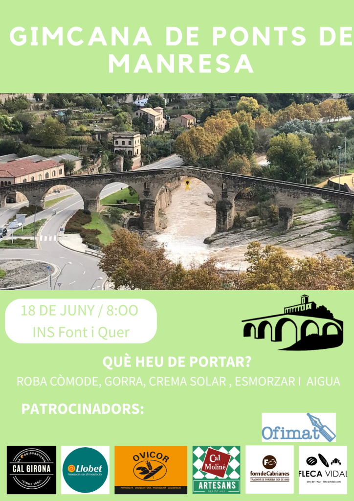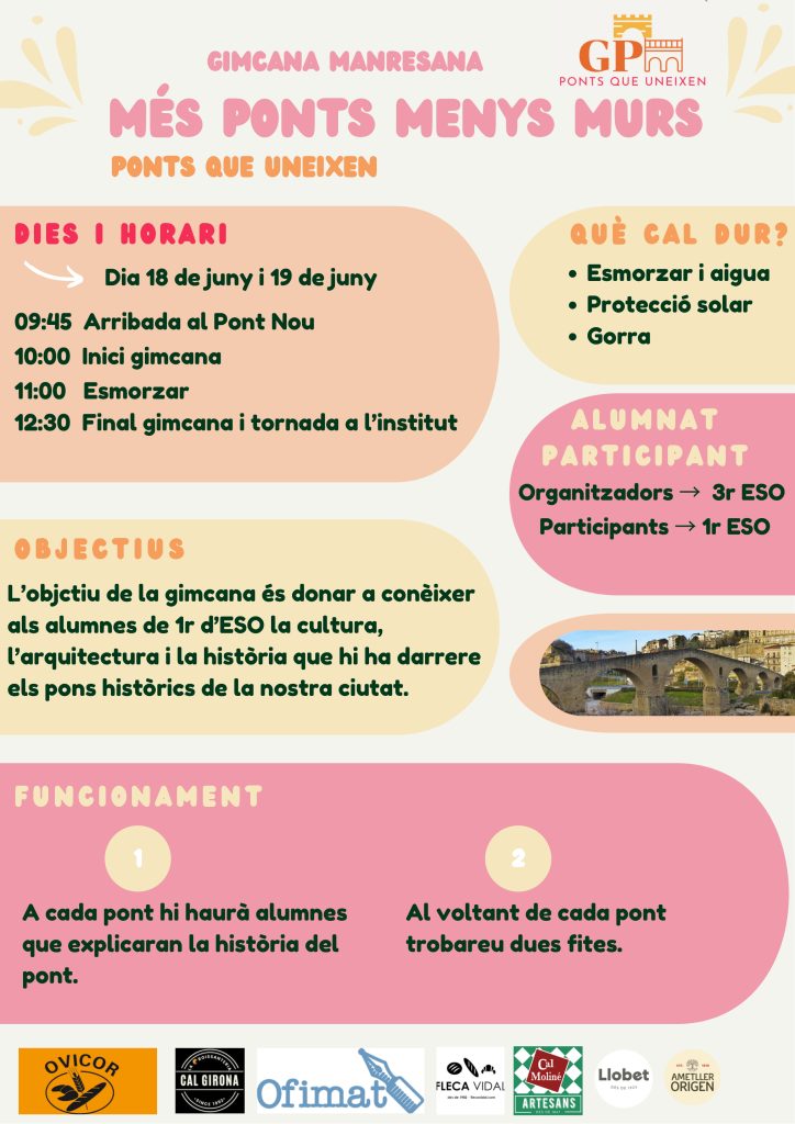 L’alumnat de 3r d’ESO aquesta setmana ha començat el crèdit de síntesi Més ponts i menys murs, on preparen una gimcana per l’alumnat de 1r. Estan preparant fites amb proves per tal de donar a conèixer els principals ponts de Manresa. Esperem que gaudeixin molt de la jornada prevista!